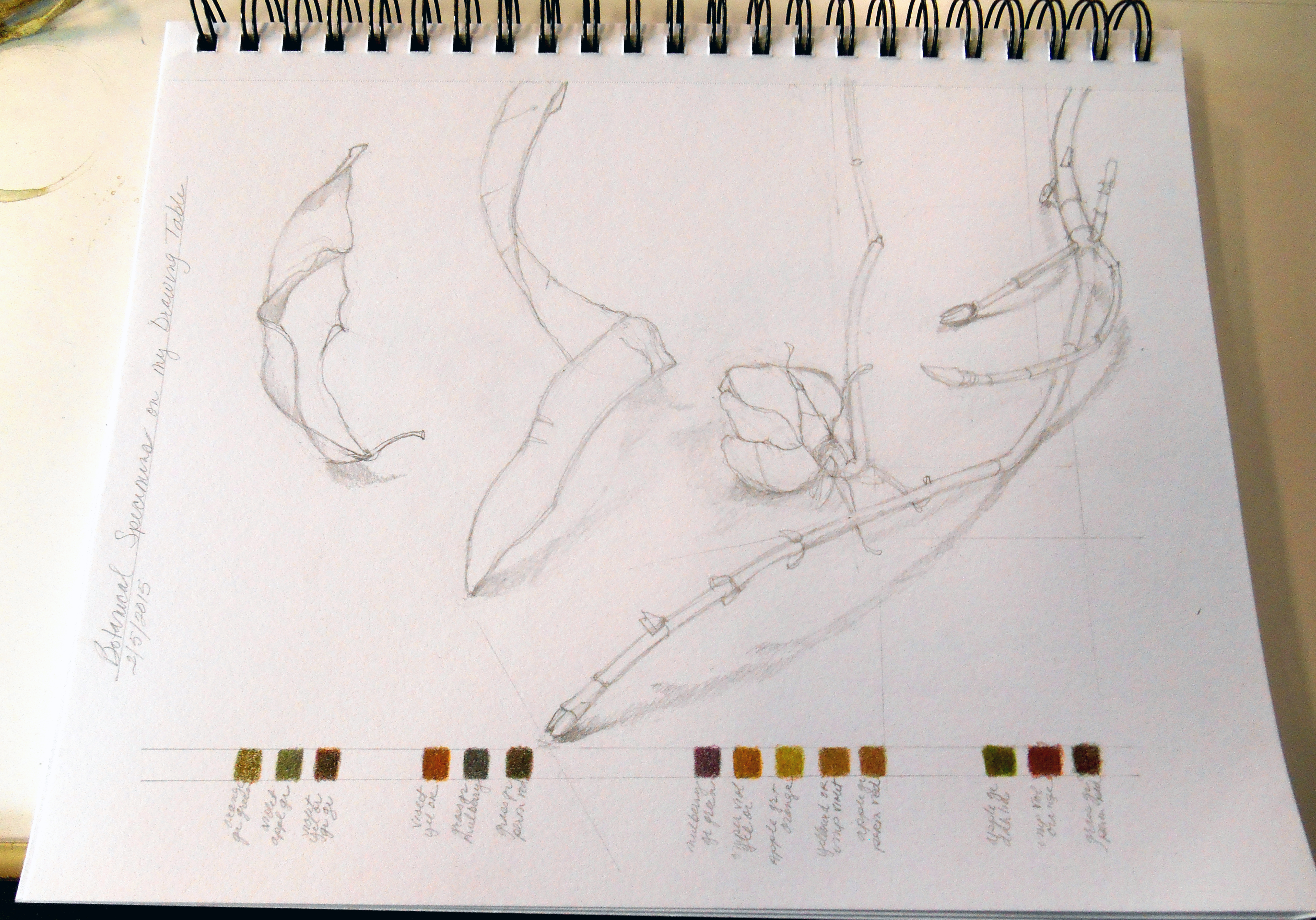 You can see that I combined two drawings for the final composition. Both were drawn on heavy tracing paper. Botanical artists never start directly with drawing on good paper, which can be expensive! You figure out your drawing first on tracing paper and then transfer it.