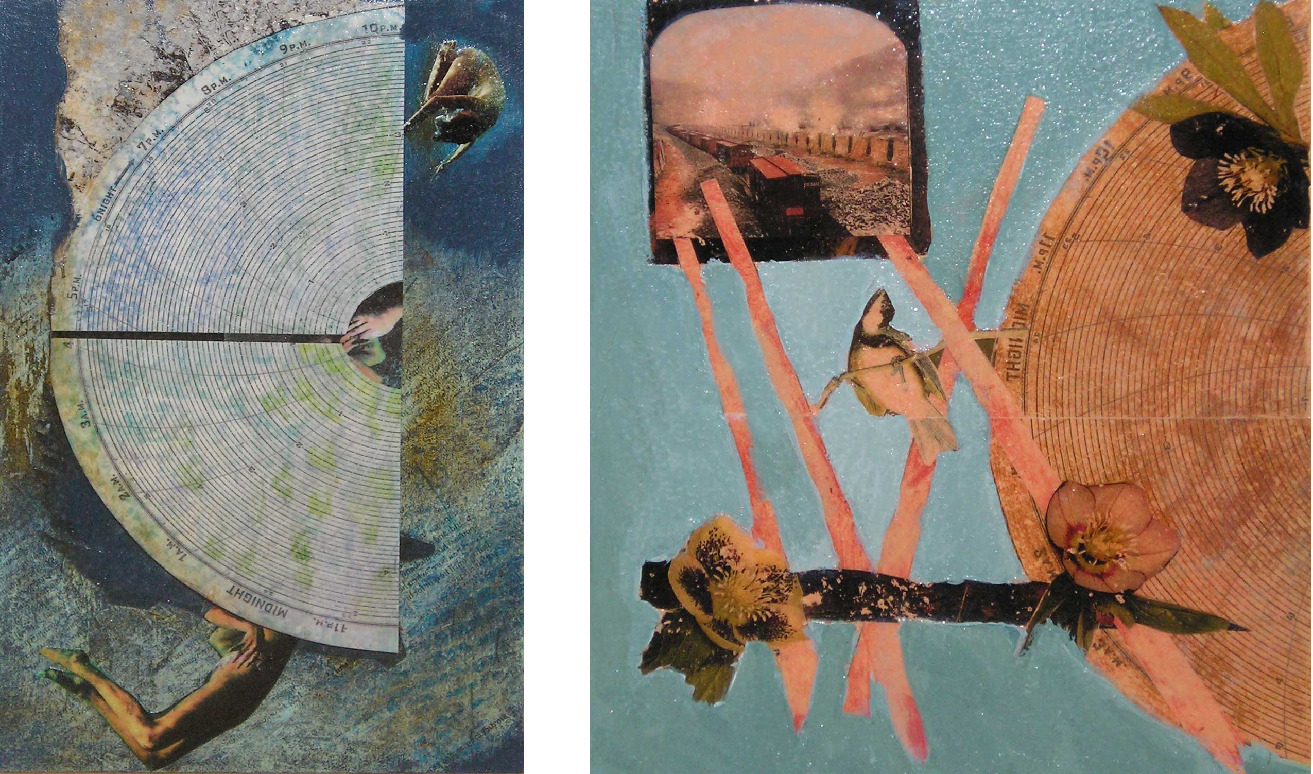 I’ve held on to this circular chart that I found in an abandoned sewage treatment facility. It was used to monitor the chlorine in the water. Putting that use aside, I was attracted to the form, the marking of time, the charting or monitoring of the water. I knew I would want to use it at some point, so here, eight years later, it is finding its way into these collages. I’m experimenting with image transfer techniques, materials and color. I like the idea of monitoring and charting, which could be a theme using various types of charts.