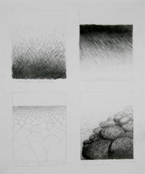 As part of my return to my artistic roots, I’ve wanted to go back to the basics and learn skills I never fully acquired or relearn what I might have forgotten. The technical aspects of drawing have never been my strong suit, and I think part of the reason is that the subjects, being largely human-made and geometric, never inspired me. I’ve always loved organic shapes and lines–the forms of fruit, vegetables, leaves, flowers, and the lines of bare trees in winter. So when I saw a class offered in botanical illustration, it seemed like it would be perfect for my needs and interests. The first class in a series, which is almost finished, has been as basic as you can get: gray scales, atmospheric perspective, texture, shading basic shapes, and shadows. Here’s one page of atmospheric perspective, using texture fading to a horizon line, overlapping shapes diminishing in size, and combining these for the last in the lower right quadrant.